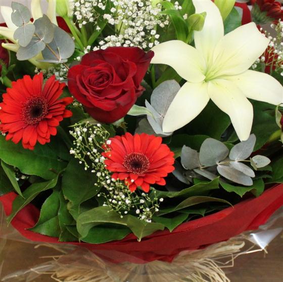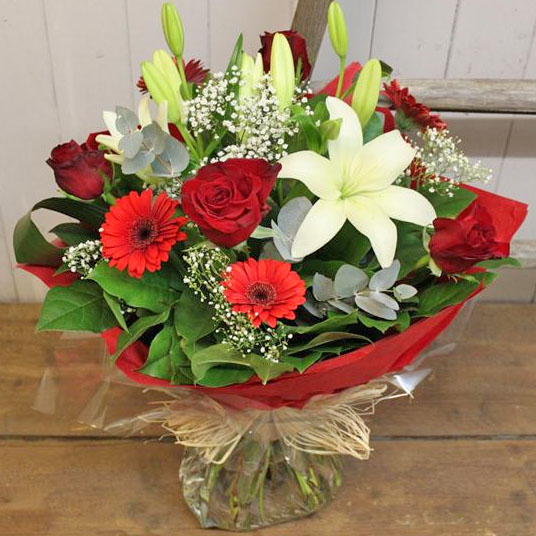 Something a little different, a hand tied of red roses, red germini and oriental lilies, all beautifully wrapped and packaged in one of our hand tied boxes.