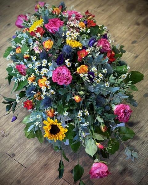 A vibrant mix of bright blooms, includes large headed cerise roses and sunflowers, comes in 3ft and 4ft