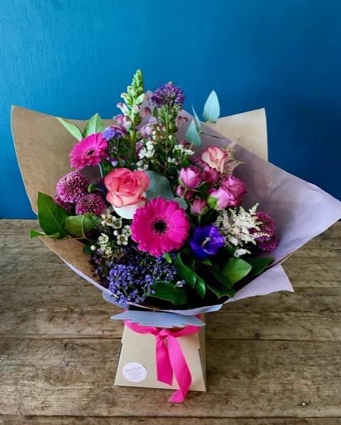 A Beautiful Handtied! Full of bright seasonal vibrant stems including Roses, placed into one of our cute gift boxes.