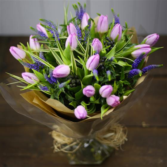 A gorgeous tied bouquet of tulips and veronica with seasonal foliage's.