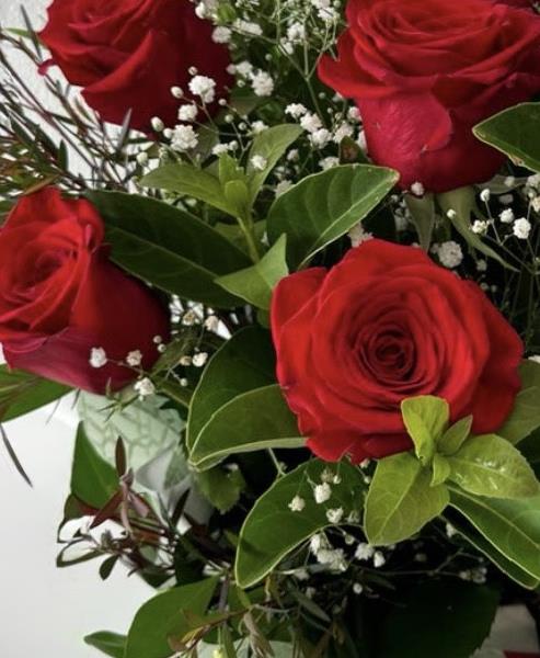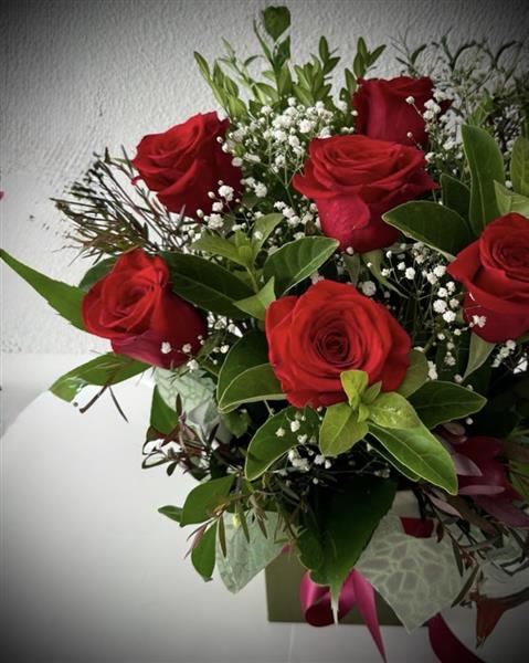 6 red roses. along with some lovely foliage's and packaged in a handtied box