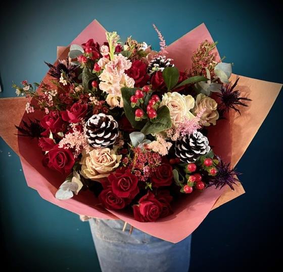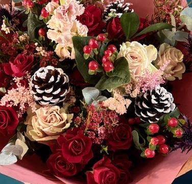This beauty is full of festive blooms, deep reds and tones of peach and light pinks. Its a stunning sophisticated bouqet that comes in three sizes. This picture show the extra large!