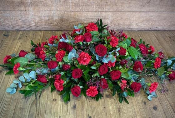 This is a beautiful red rose casket spay, with other flowers to tone, also includes lovely soft foliages, This spray is 3ft in size but also comes in 4ft and 5ft.