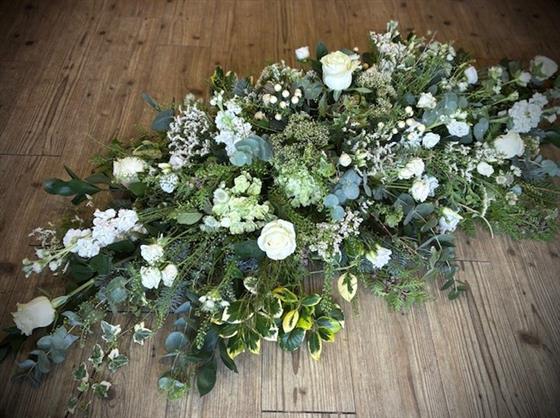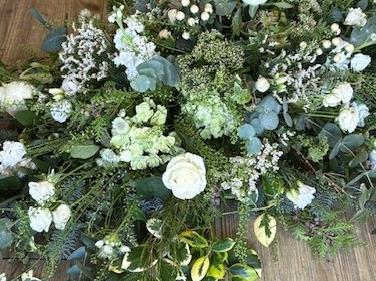 This casket spray has a loose and wild feel to it, it comes in the larger sizes of 4ft and 5ft. It contains neutral whites and beautiful wild foliages giving it a rustic and loose feel